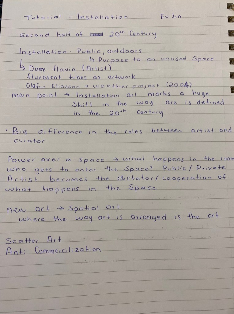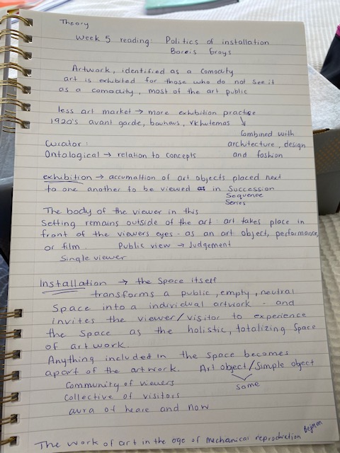 Installation – an installation in Groys opinion is the space itself. The installation transforms a public, empty, neutral space into a individual artwork. The art invites the viewer/visitor to experience the space as the holistic, totalizing space of artwork. Anything within the space becomes the artwork. An installation creates a community of viewers. Visitors view the space as a collective experiencing the space together.