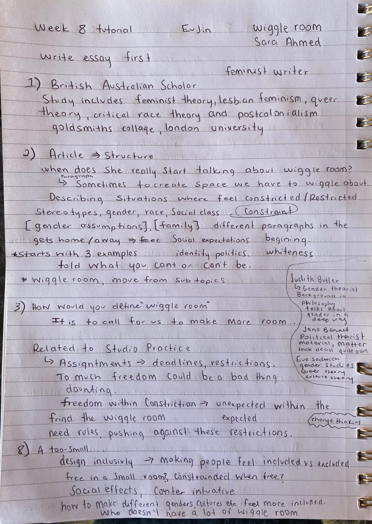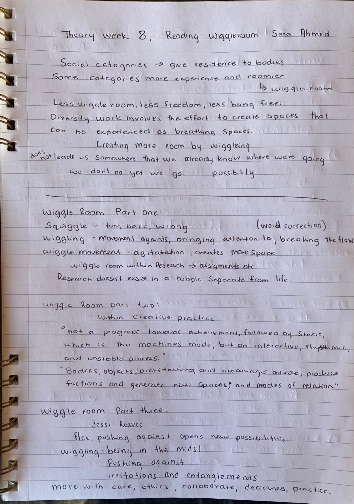 In Sara Ahmeds project ‘Wilful subjects’ she discusses how the idea of wiggling can be connected to one’s wilfulness. Ahmed says that we would be willing to create spaces to wiggle and push against restrictions even if the space/room we were in wasn’t made for you.