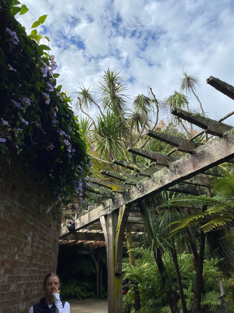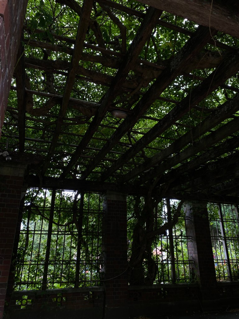 Pictured above is a section of the pergola I was drawn to. This area features a large vine like plant with purple flowers. The plant spreads itself along the pergola while also running down the brick wall. Leaves of the plant fall between the gaps of the pergola creating a moment of serenity as nature encompasses you.