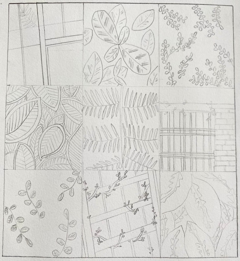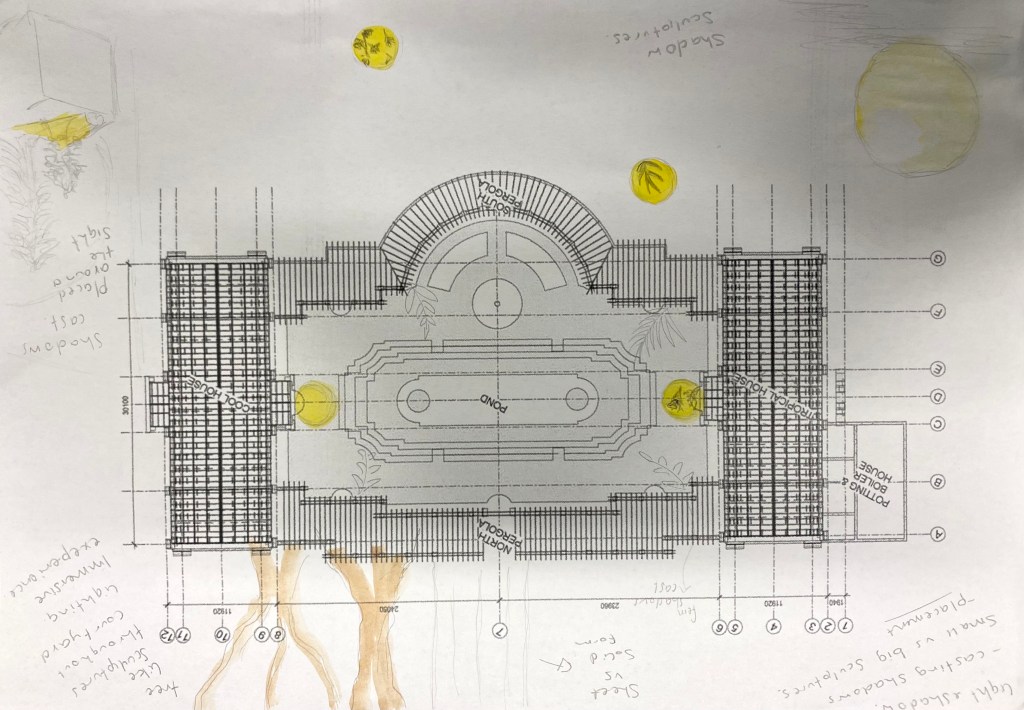 I spent time thinking about the layout of my presentation. I considered things such as size and boldness of images. I felt that the layout of lighting was an important piece of information for my design so I knew I wanted the plan of the fernery to be A2. I printed most of my perspectives of the site in A3 so that viewers could grasp a sense of the atmosphere created. Below was the initial layout plan I created when printing.
