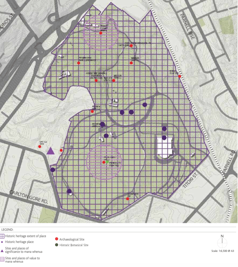 Featured below is an illustration showing the location of mana whenua, heritage and cultural elements that are recorded and known within the Auckland Domain.