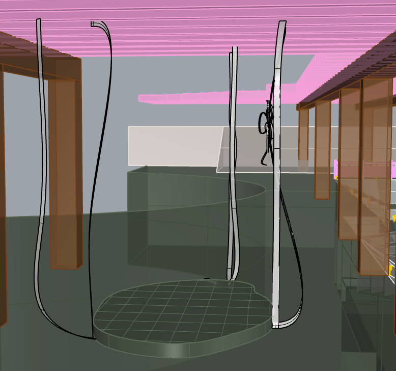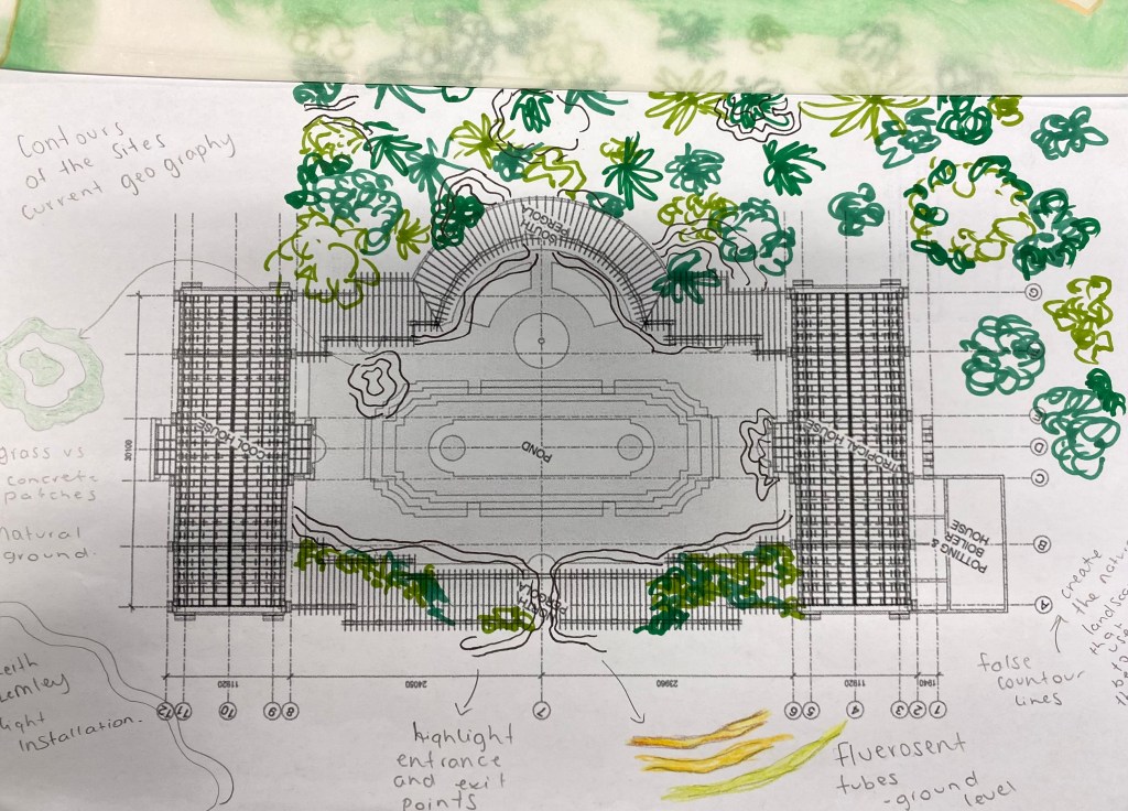 Points from feedback: Although there were some interesting lines that I had chosen from the contour plan I was told that there is not a clear connection to how they relate to the Winter Gardens. Moving forwards I need to continue my design development to create more iterative designs that speak to my concept. I also need consider how the lighting is fixed and placed throughout the fernery. Further questions I need to ask are what does it mean to light up a space? And what effect may this have on the plants themselves.