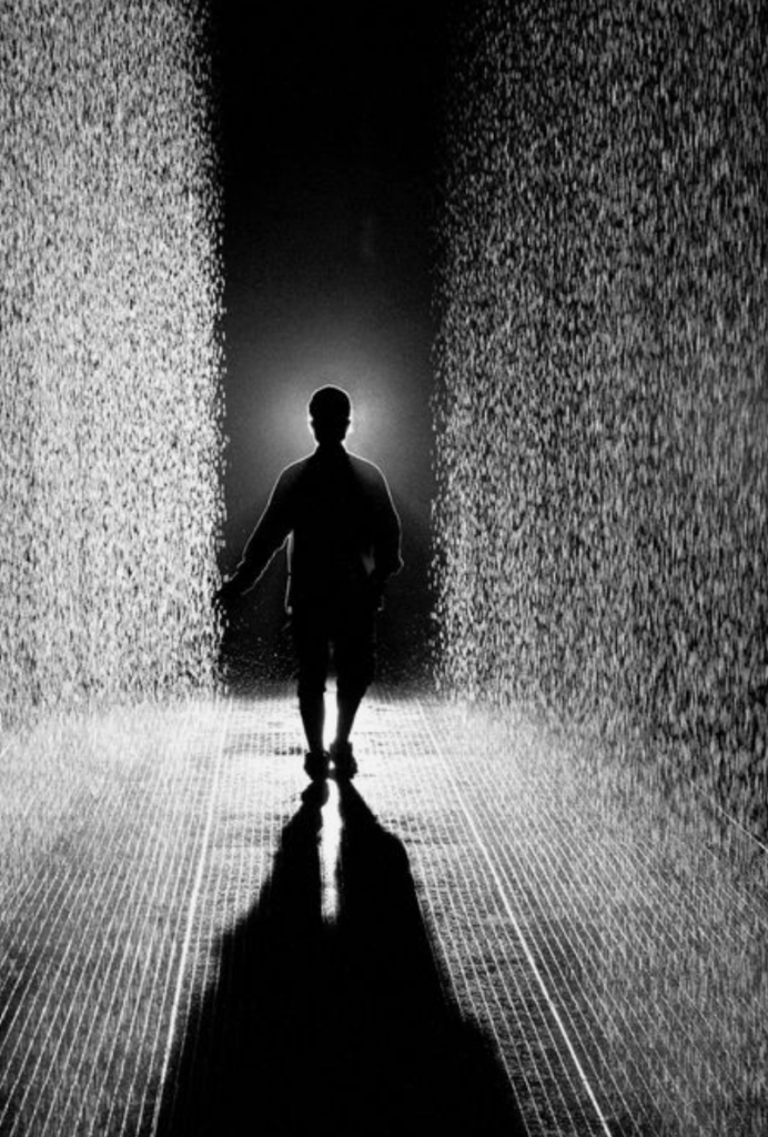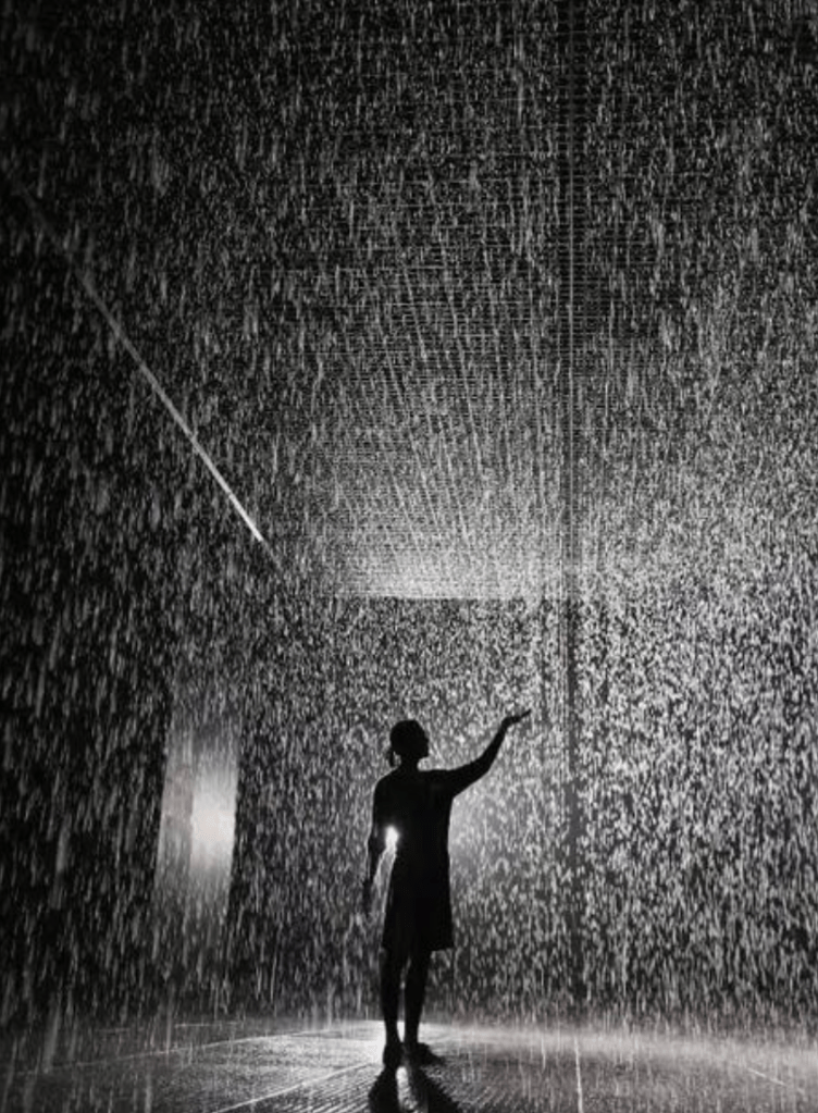 Random Internationals Rain Room is a interactive work that merges art, technology and nature. A visceral and emotive experience, Rain Room creates a theatrical space that invites each patron to respond to and question their relationship with the installation, and on a deeper level, their relationship with nature and the environment. Rain Room is a 100 square metre expanse of torrential rainfall that responds to your presence and movement; protecting you from the rain as you navigate the space.