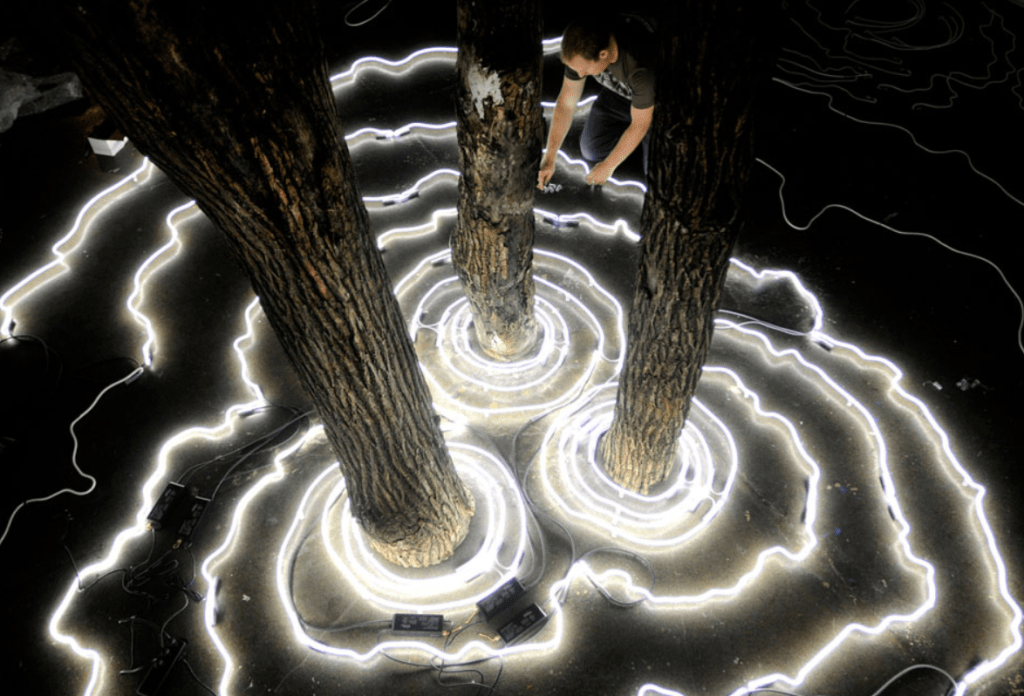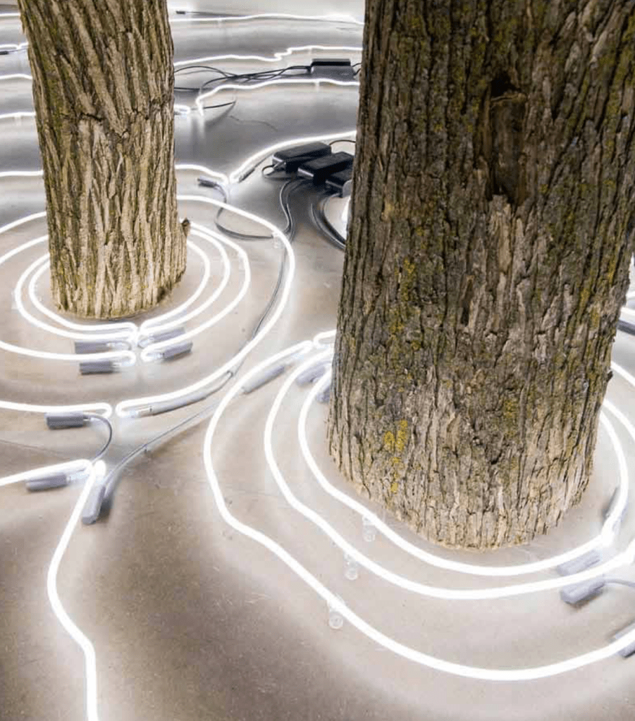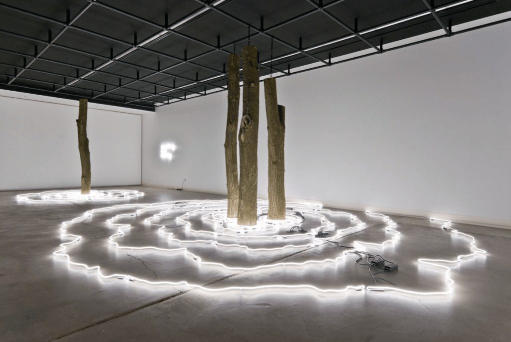 This sculptural installation by Keith Lemley consists of concentric rings of white neon tubes that mimic the natural variation found in the logs at the centre. The work creates a space for a dialogue between nature and technology by filling the gallery with artificial light that is delivered through seemingly organic forms.