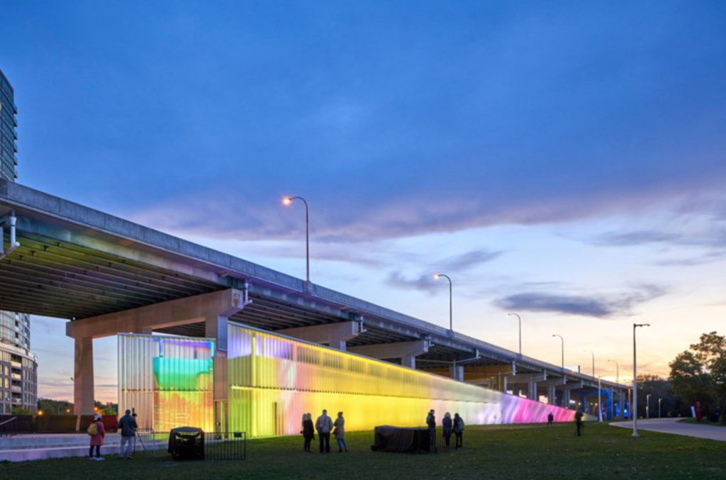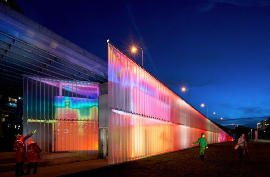 Thermally Speaking designed by Leuwebb Projects is a light installation that uses thermography and infrared measuring instruments to reveal body energy through experiential illumination. The responsive installation transformed Toronto’s York visitor centre providing a glimpse into the future of body temperature readings, creative data visualisation and surveillance fields. Thermal cameras in the area relay and translate the heat engird of visitors into a shifting curtain of light, animating the channel glass facades of the building.