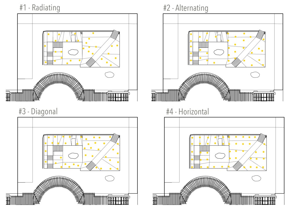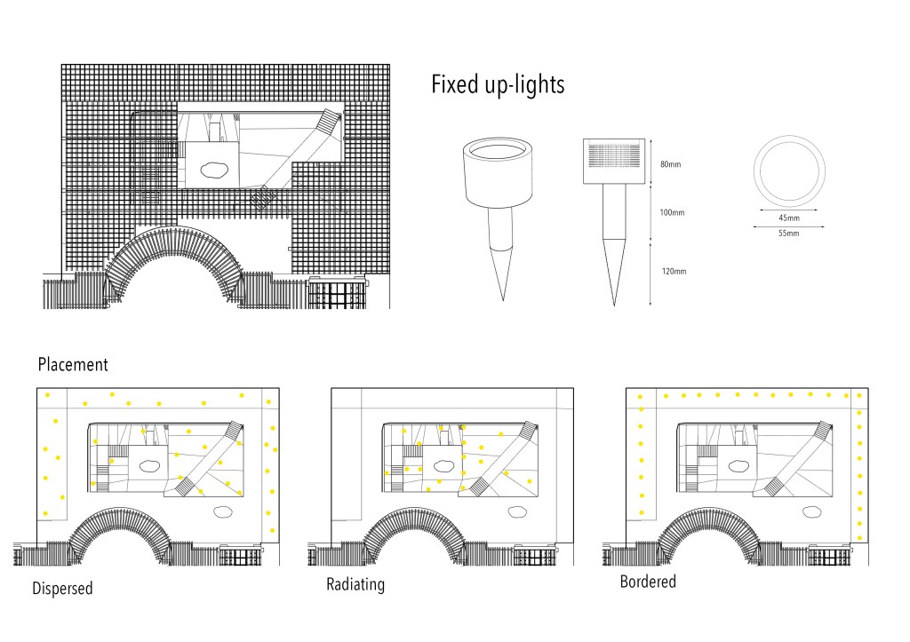 As seen above I worked through a series of layouts that focused on the up-lights being placed only in the centre area of the fernery. Ive decided to move forwards with the alternating pattern as I believe this composition evenly disperses light throughout the space without being too structured like a grid.