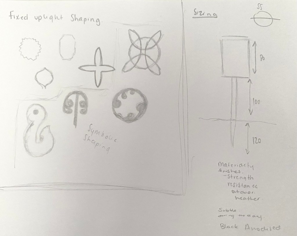 I also worked on creating visuals that communicate my ideas around each of the lighting features within the fernery. I included dimensions so viewers could gather a sense of scale and placement of each sculpture can be seen on the plan and section views of the site.