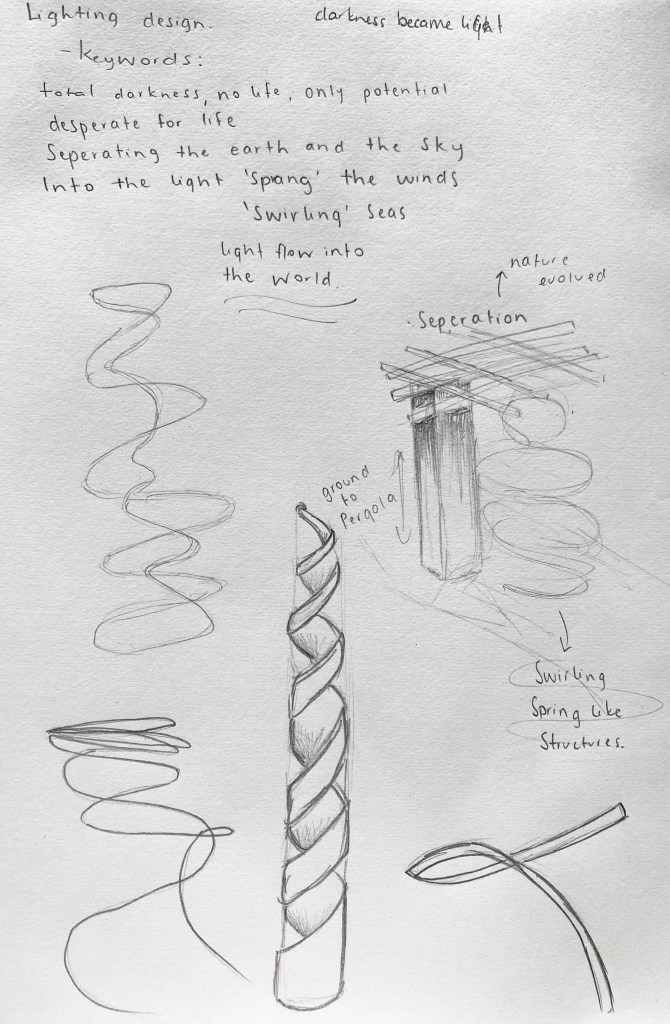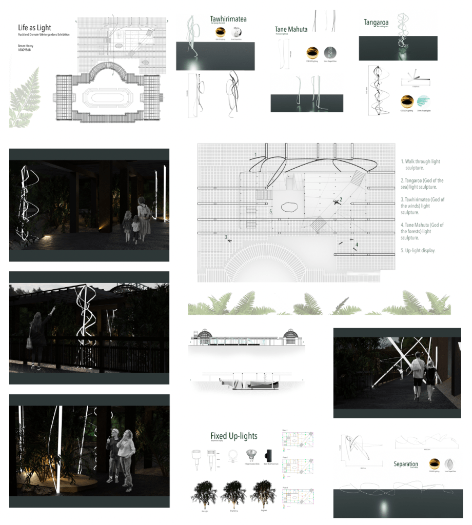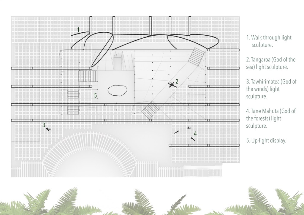 As a result of this thinking my plan to move forwards is to develop multiple lighting structures that emphasise the native plants placed within the site. I plan to do this by designing a lighting display that showcases ideas around New Zealand/Maori history and beliefs towards the natural world. Through research of Maori origins I have found that they trace themselves back to the beginning of creation – Te Kore (total darkness). There was no life, only potential. Papatuanuku (the Earth Mother) and Ranginui (the Sky Father) were clasped together, stifling all growth. Their children, desperate for light devised a plan where one of them, Tane Mahuta (God of the Forests) would separate his parents. Binding to his mother below he pushed upwards with his legs pushing his father apart from the earth. Into the light sprang the winds of Tawhirimatea (God of the Winds), the swirling seas of Tangaroa (God of the Sea) and the towering forests of Tane Mahuta.