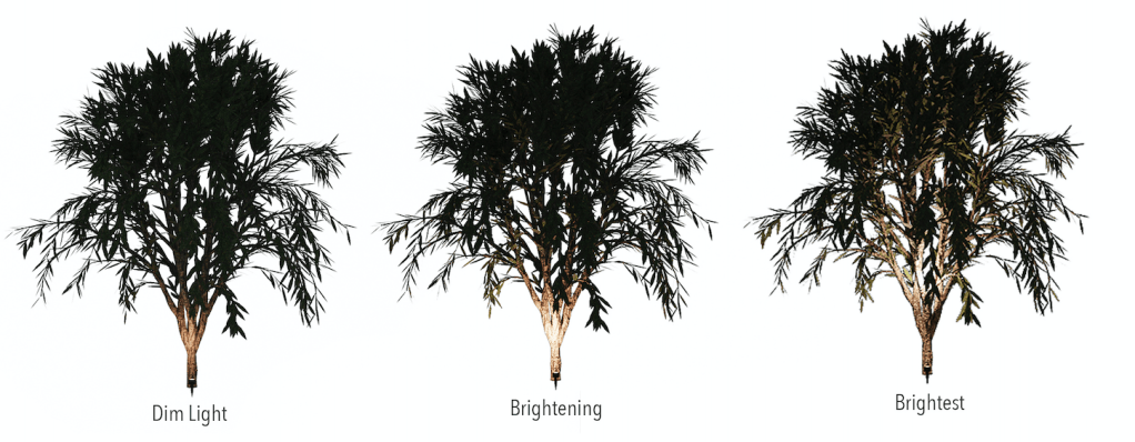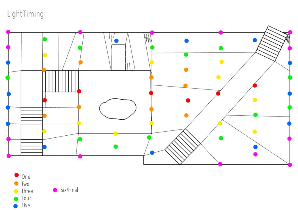 The up-lights will run on an automatic loop that moves through three bright to dim phases. Each phase works from a key idea where the brightening starts from a central area and surrounding lights are slowly activated until all have reached full brightness. The lights all then delicately dim down to darkness all at once. The cycle then continues to the next phase. I decided to work with multiple phases so that the rotation of light didn’t seem repetitive. Each phase from step one to six will take a total of 3 seconds to reach full brightness (a light group will turn on every 0.5 seconds). It will then take 5 seconds for all the lights luminance to slowly dull to their original shine before continuing to the next phase pattern.