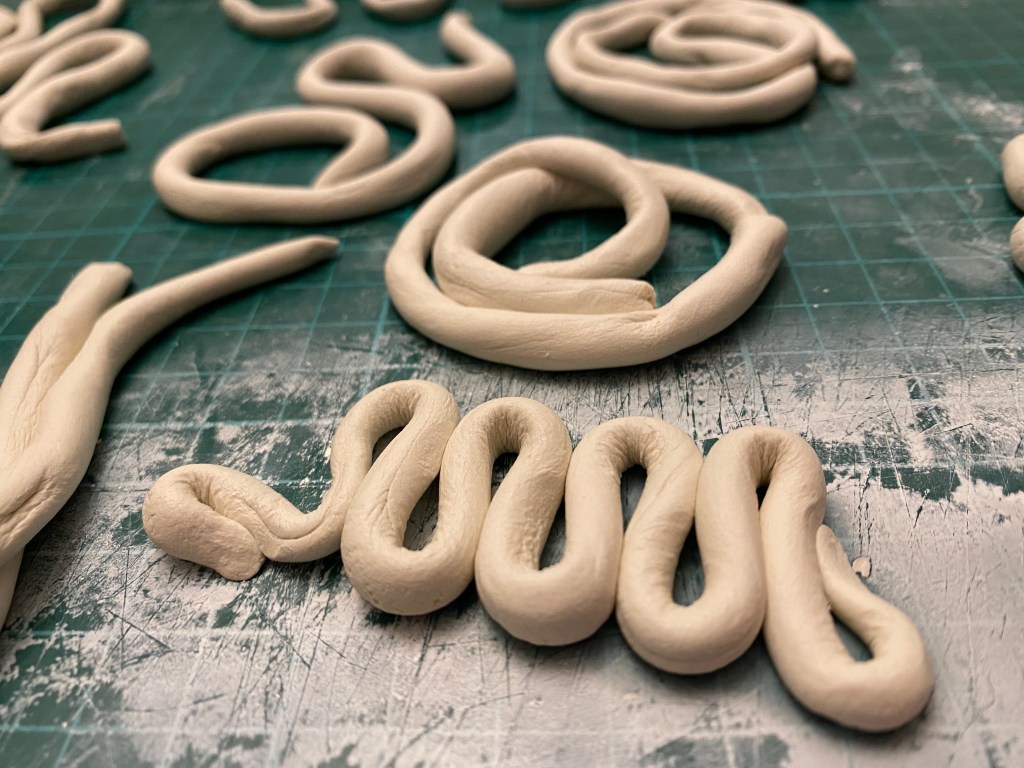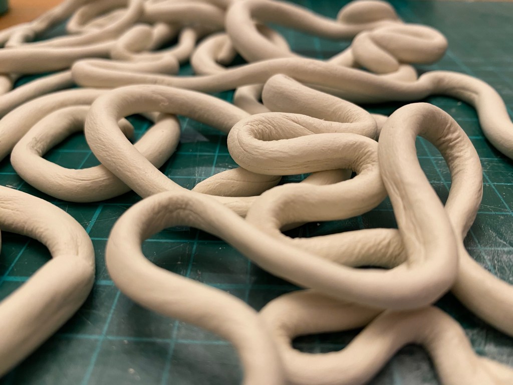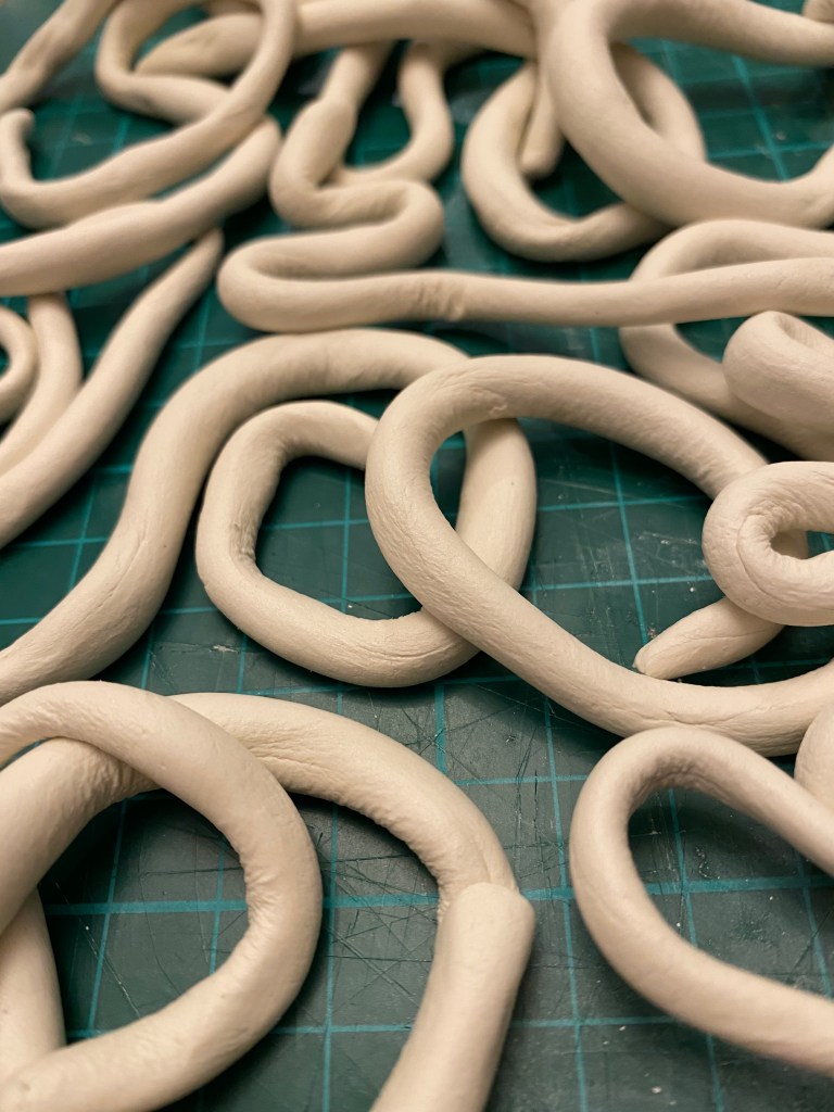 When thinking about flowing shapes and how different curves could fit together I decided to model some shapes from clay to piece together different sculptures. Layering of shapes became interesting as patterns formed in the negative space.