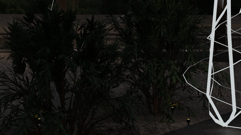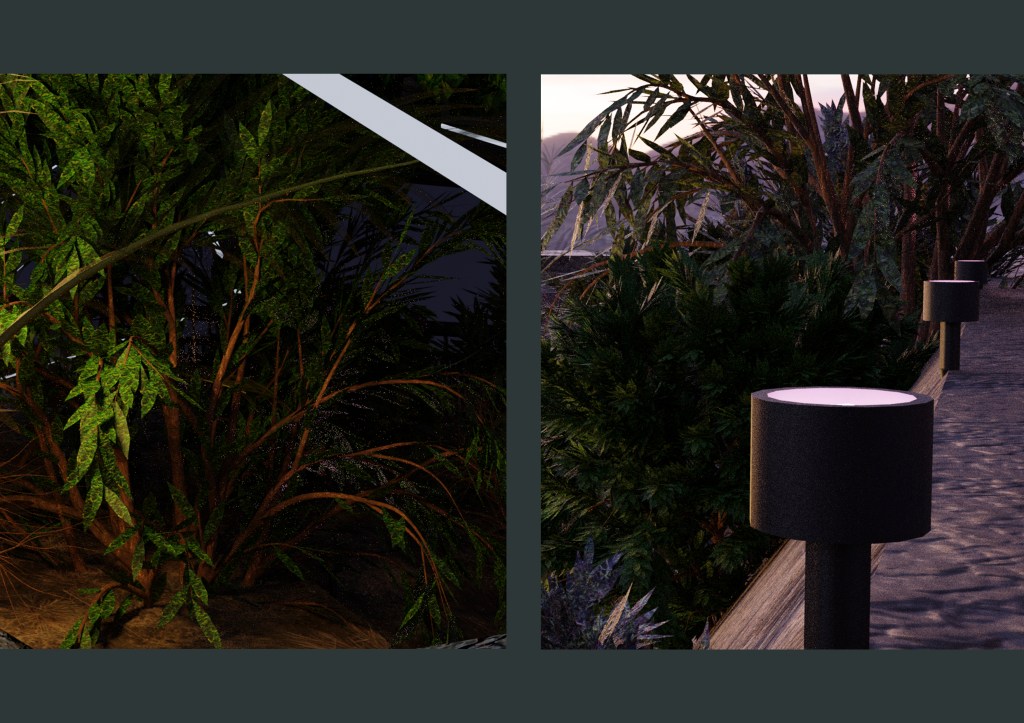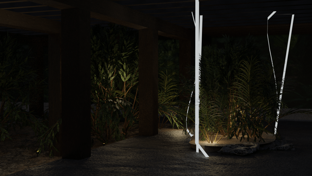 Small round up-lights made from matte black aluminium are also spread across the lower parts of the fernery where the paths do not explore. The lights will shine brightly then fade to a dim light through three phases as if breathing slowly. An inhale and exhale of light.