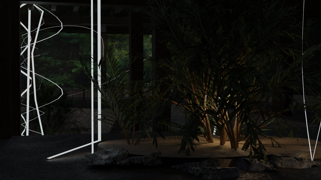 This week I focused on creating a series of renders, plans and sections that help to tell tell the story of my design. I exported my rhino fernery model into blender and experimented with different ways I could apply materials. Adding trees to the model was challenging however I was able to develop some imagery that created the atmosphere I envisioned for the space.